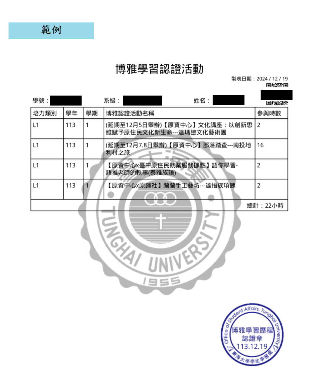 - 「博雅認證活動歷程證明」範例圖片:(培力類別須為L0/L1/L2)